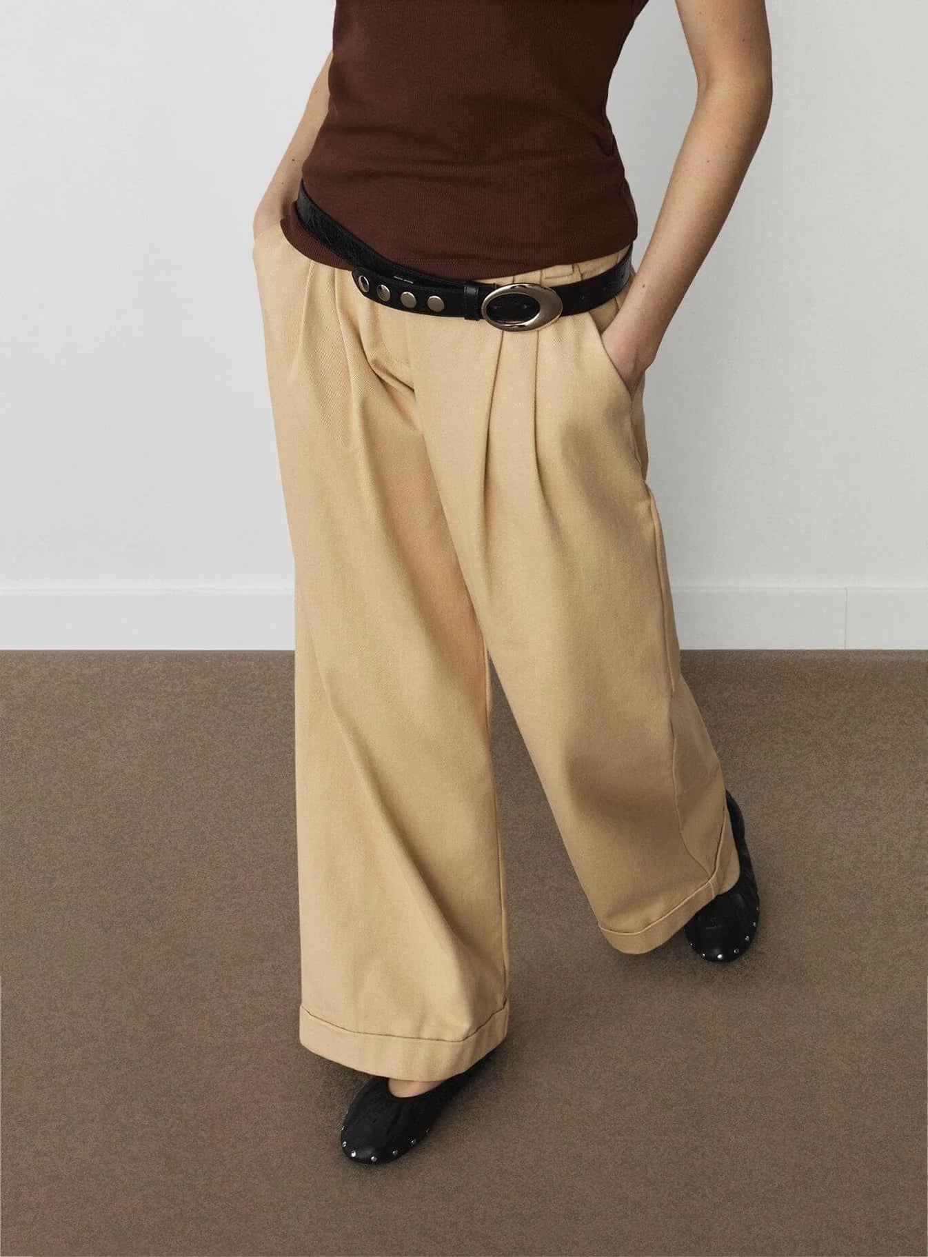 High-waist asymmetric tailored pants with double waistband and front darts. Turn-up hem. Two side pockets. Front interior zip and button fastening.